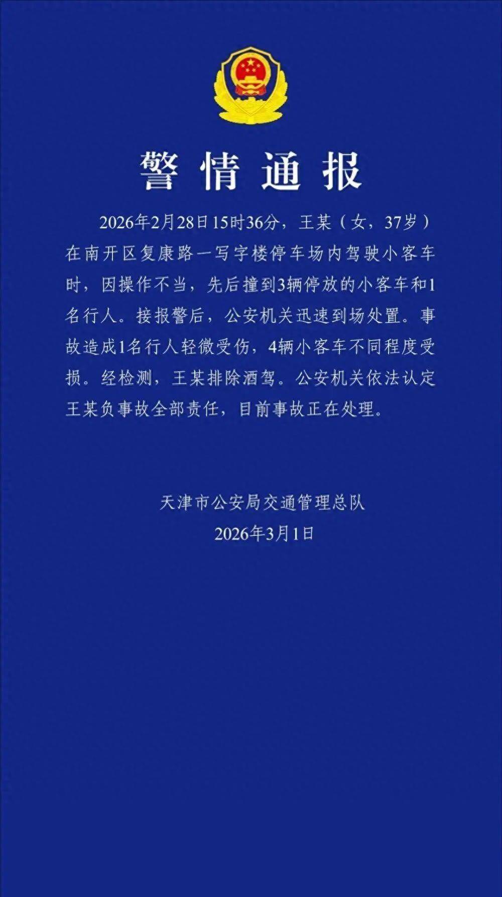 2026年2月28日15时36分,王某(女,37岁)在南开区复康路一写字楼停车场内驾驶小客车时,因操作不当,先后撞到3辆停放的小客车和1名行人。接报警后,公安机关迅速到场处置。事故造成1名行人轻微受伤,4辆小客车不同程度受损。经检测,王某排除酒驾。公安机关依法认定王某负事故全部责任,目前事故正在处理。